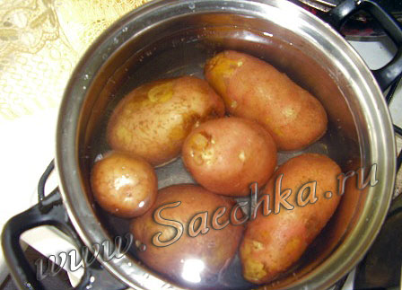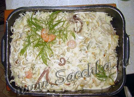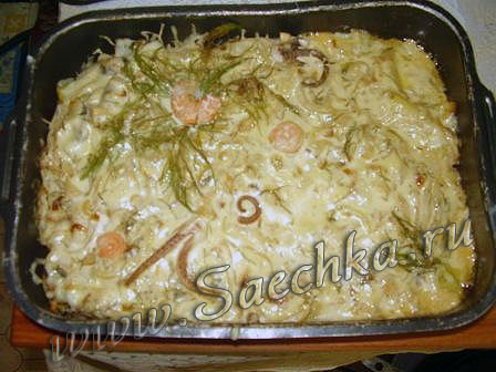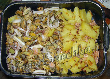 - Вареный картофель и рыбу (отдельно) обжариваем до золотистой корочки на сливочном масле и укладываем в смазанную маслом форму, сверху укладываем морепродукты (я уложила только половину, т.к. мои их не едят).