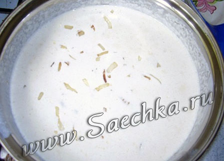 - Лук нарезаем 1/4 кольцами и обжариваем до золотистой корочки. Заливаем его сливками и увариваем минут 15.