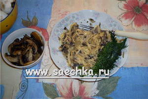 - Готовим фарш. Репчатый лук нарезаем полукольцами и обжариваем, добавляем предварительно отваренные грибы и тоже чуть все это пожарим (я брала шампиньоны свежие, а можно купить консервированные). Туда же добавляем тертый на крупной терке сыр, мелко нарезанный укроп, солим, перчим.