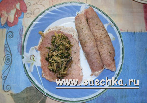 - Отбитое мясо выложить на ладонь, положить начинку и формируем котлеты овальной формы.