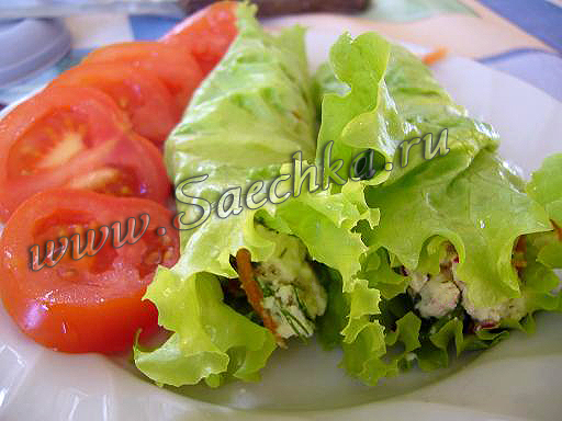 - Листья салата вымыть и обсушить, на каждый положить по 1 ст.л. творожного фарша и завернуть.