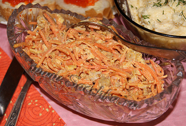 Вкусный и сытный салат приготовлен с шампиньонами, корейской морковью и сыром. Обязательно попробуйте! Очень пикантный вкус!