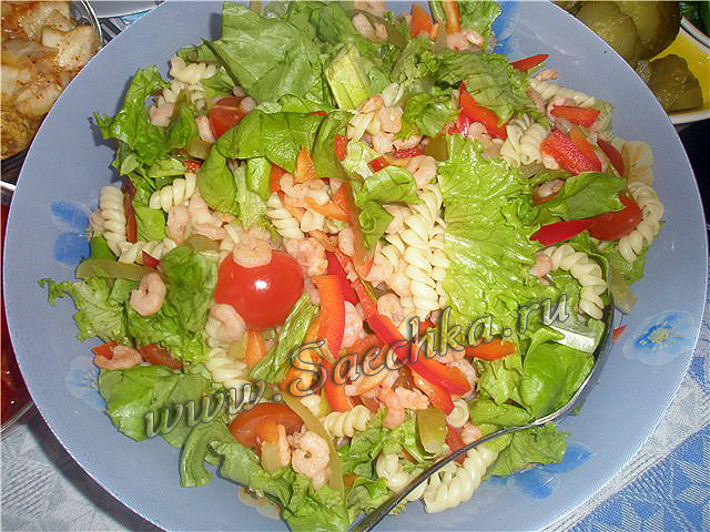 Салат приготовлен с креветками и макаронами без майонеза, заправлен оливковым маслом и бальзамическим уксусом. Очень вкусный салат, подружка из Сирии привезла.
