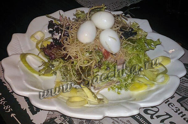 Этот рецепт салата «Гнездо глухаря» очень лёгкий, особенно если картофель фри заменить жареным луком.