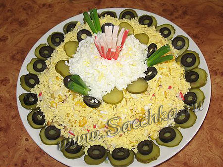 - В последний раз украсила маслинами, луком и крабовыми палочками.