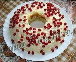 - Верх хорошо смазать майонезом и посыпать гранатовыми зёрнами.