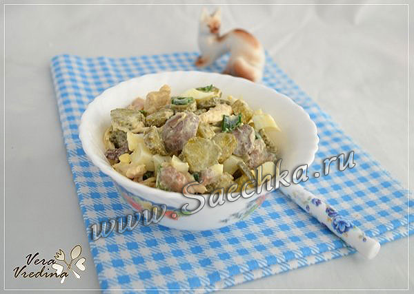 Салат приготовлен с шампиньонами, курицей, маринованными огурцами и яйцами. Получилось очень вкусно, чессслово!