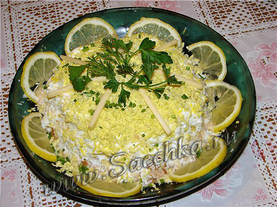 - Далее выкладываем салат "Мимоза" на блюдо слоями в следующем порядке (через майонез):
