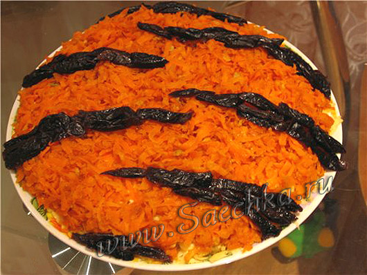 - Поставить салат «Тигрица» на 2-3 часа на пропитку в холодильник. Салат получается очень сытный и сочный, яркий внешне и по вкусу.