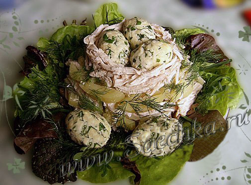 - Из желтка, сыра, майонеза и петрушки сформировать яички уложить в "гнездо" (желток и сыр натереть на мелкой терке, перемешать с мелко рубленной петрушкой, добавить майонез, чтобы получилась густая масса).