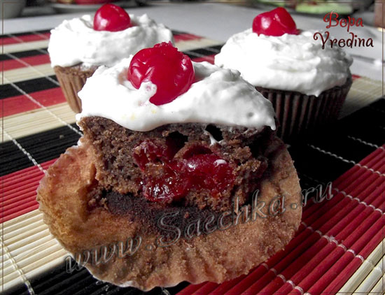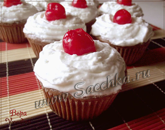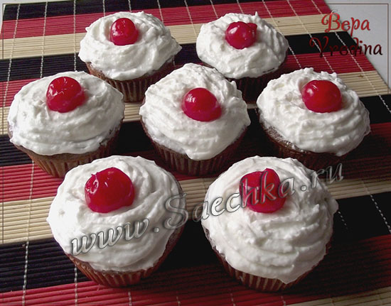 - Украсить шоколадные кексы взбитыми сливками и вишней.