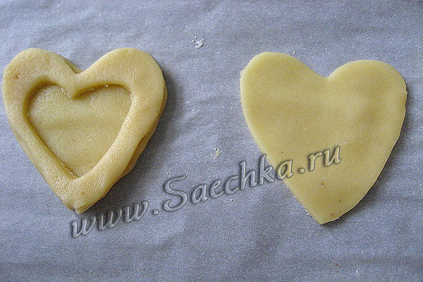 - На каждое цельное сердечко положить сердечко с вырезанной серединой смазанной стороной вниз. Слегка прижать, чтобы сердечки склеились.