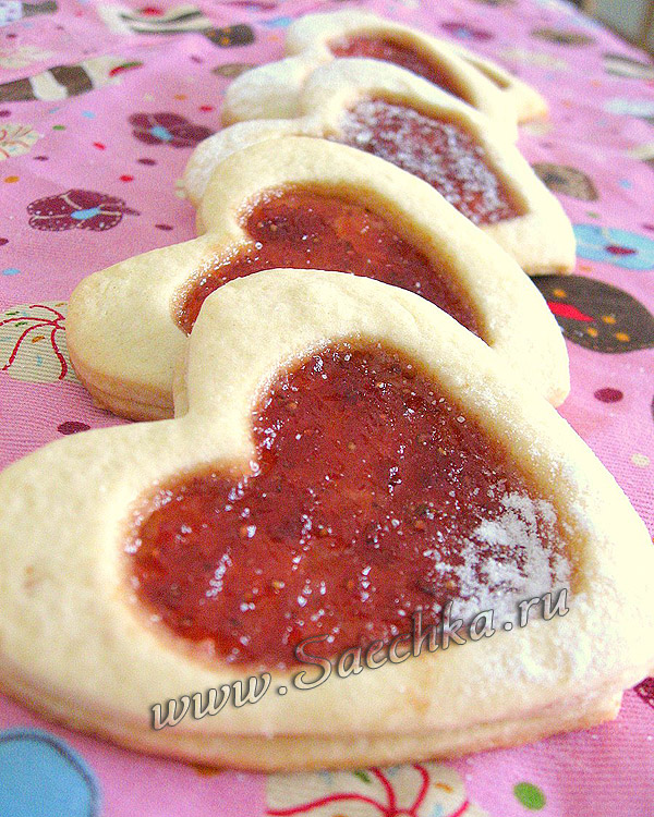 Миндальное печенье «Сердечки» к 14 февраля приготовлены с клубничным вареньем.