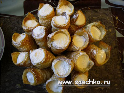 - Белки, ванильный и обычный сахар хорошо взбить вместе. Наполнять холодные трубочки.