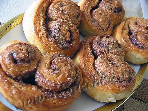 - Разворачиваем и выкладываем на противень, можно застеленный пергаментом и ставим плюшки в духовку минут на 25-30 при температуре 180-200 градусов.