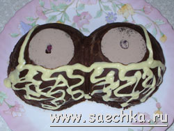 - Бисквит выпечь просто на противне, как для рулета. Вырезать из полученного бисквита низ торта - восьмерку, диаметр каждого кольца которой соответствует диаметру Вашей мисочки, в которой выпекали полусферы. Кольца восьмерки должны пересекаться, на них мы дальше будем ставить полусферы и формировать грудь. Бисквит в виде восьмерки пропитать джемом или вареньем. Оставшийся бисквит нарезать кубиками небольшими.