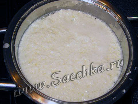 - На медленном огне наше молоко быстро сворачивается и отдает весь свой белок, сыр коржом поднимется на верх, отделившись от сыворотки. Это произойдет минут через 5-7.