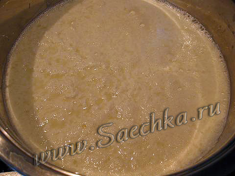 - Через два дня доведем до кипения свежее молоко, убавить огонь и влить нашу скисшую сыворотку (на первый взгляд покажется что с сывороткой никаких изменений не произошло, даже запах будет приятный, но не обращайте внимания, что должно было случится уже случилось).