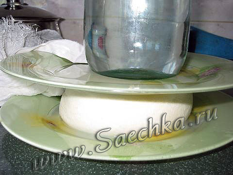 - Между двух тарелок, сверху литровая баночка с водой, выделяющуюся воду можно сливать, затем так и поставить с прессом сыр на ночь в холодильник.