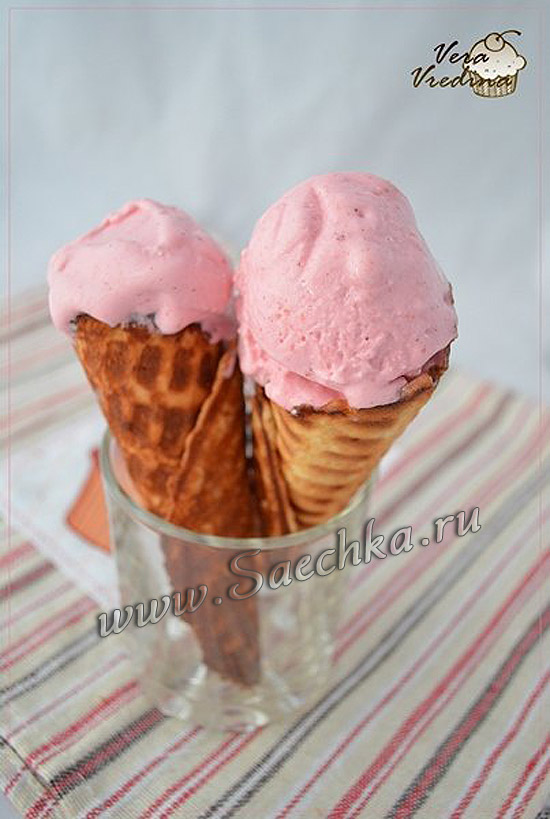Домашнее мороженое приготовлено из красной смородины, но можно готовить и из чёрной. Подавала в вафельном рожке.