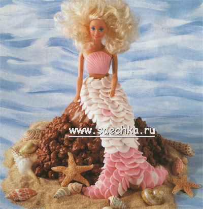 Этот торт вызовет сенсацию на дне рождения любой маленькой девочки. Чешуйки можно вырезать формочкой в виде полумесяца или круглой диаметром 2,5 см. Получившиеся кружки разделите пополам. Для украшения используйте также ракушки, морские звезды и другие дары моря.
