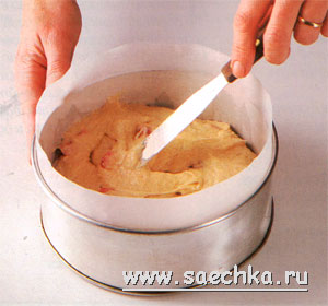 - Выложите тесто в форму разровняйте поверхность. Сильный хлопок по форме позволит устранить все воздушные пустоты.