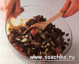 - В большую положите темный изюм, светлый изюм - кишмиш, коринку, засахаренные вишни, разнообразные цукаты, миндальные хлопья (орехи, разделенные на тонкие пластинки), добавьте крупно натертую цедру и сок лимона, коньяк или шерри.