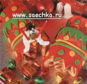 - Слегка затяните сахарную помадку с тех местах, где она соприкасается с концами рулета. В целом все должно напоминать рождественскую хлопушку. Вставьте отрезанные кусочки в свободные концы красной сахарной помадки так, чтобы она не опала. Вымесите обрезки красной помадки, раскатайте и вырежьте 2 кружка того же диаметра, что и у раструбов на концах "хлопушки". Увлажните края водой и приклейте кружки к краям помадки, плотно защипывая их.
