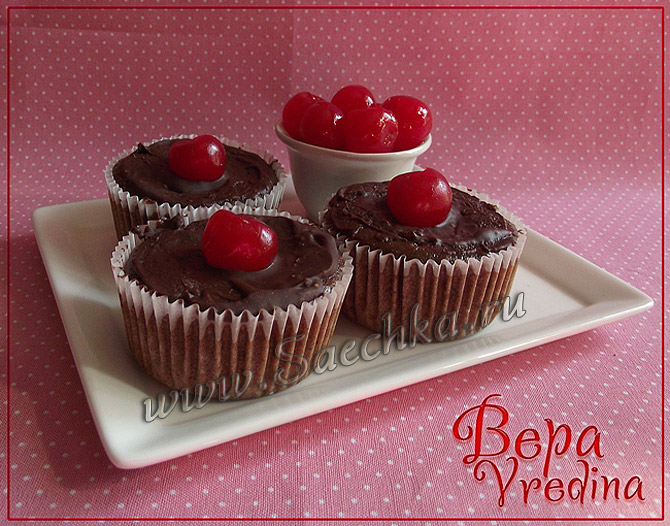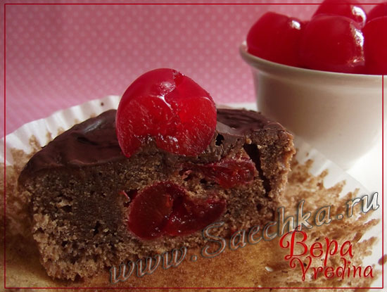 - Вынуть кексы с ягодами из духовки и на каждый положить вишенку.