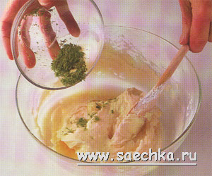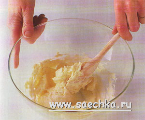- Положите масло в миску и взбейте его деревянной ложкой или электрическим миксером в пышную массу.