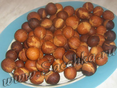 - В сотейнике хорошо разогреть масло, опустить в него шарики и, непрерывно помешивая, обжарить их до легкого золотистого оттенка.
