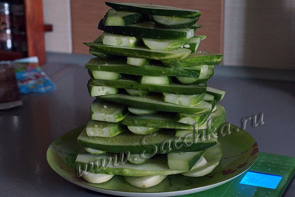 - Огурцы очистить от кожицы, если они горчат. У меня были нормальные, поэтому я не стала этим заморачиваться. Нарезать продольными пластинами толщиной примерно в 1 см.