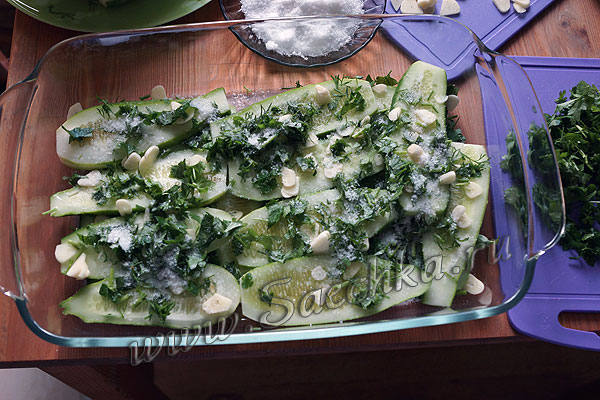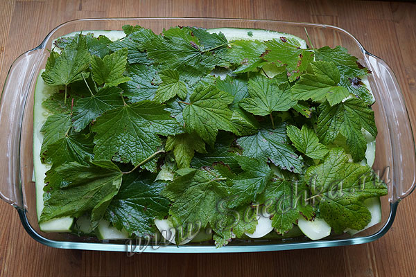 - Пока вода остывает до комнатной температуры, огурцы сложить в стеклянную или керамическую ёмкость, пересыпая каждый слой солью, мелко нарезанной зеленью и чесноком. Сверху положить листья смородины.