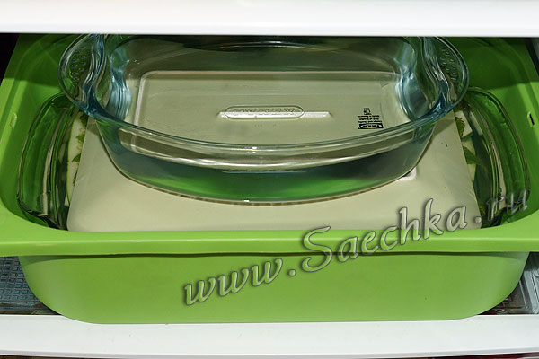 - Залить огурцы остывшей водой с уксусом, накрыть чем-то и поставить под гнёт на сутки в холодильник (я поставила еще в плошку на случай, если рассол начнет вытекать).