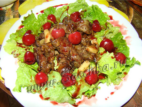 «Горячий» салат приготовлен из куриной печени и черешни - это очень необычно, нежно и вкусно!