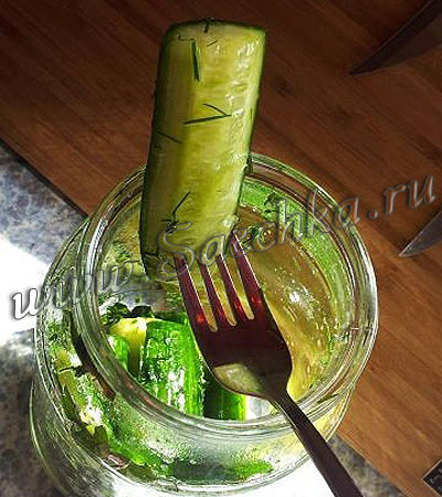 - Оставить при комнатной температуре на 2 дня. Можно попробовать огурцы и раньше, но на второй день они просолятся в меру.