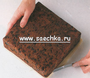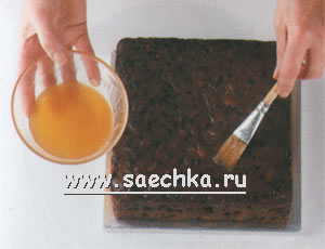 - Снова переверните торт и поместите его на поднос. Смажьте боковые стороны торта абрикосовым желе. Соберите обрезки марципана и снова вымесите их. Следите, чтобы в марципан не попали бисквитные крошки.