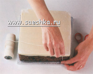 - Отрежьте кусок шпагата, равный по длине стороне торта. Отмерьте и отрежьте еще один кусок шпагата, равный по длине высоте торта.