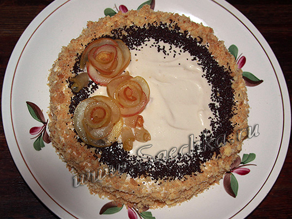 - Обрезки от коржей измельчить в крошку. Дать торту «Апфельмусс» настояться несколько часов.