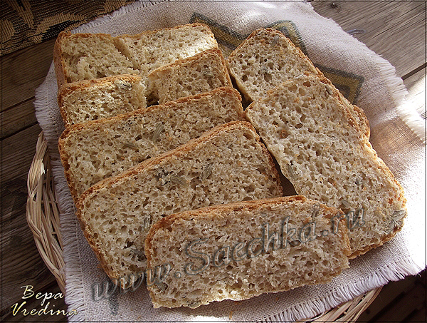 Хлеб приготовлен с овсяными хлопьями, мёдом, тыквенными семечками и майораном в хлебопечке.