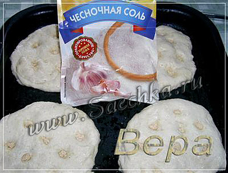 - Сделать в каждой лепешке несколько углублений. В углубления посыпать чесночной солью.