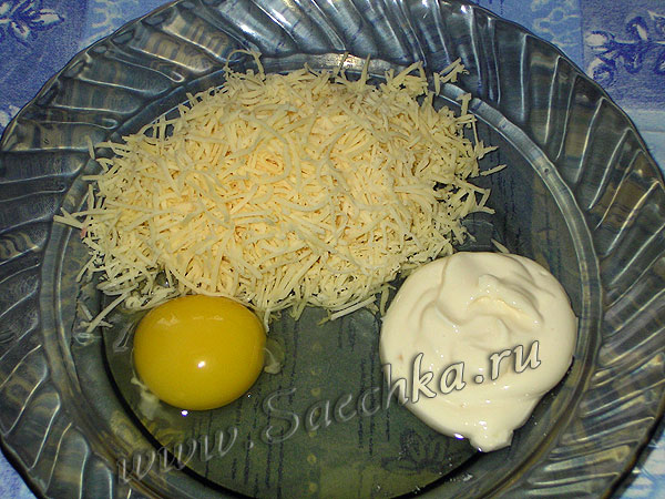 - Натереть сыр, добавить яйцо и майонез (сюда еще неплохо натереть чесночок):