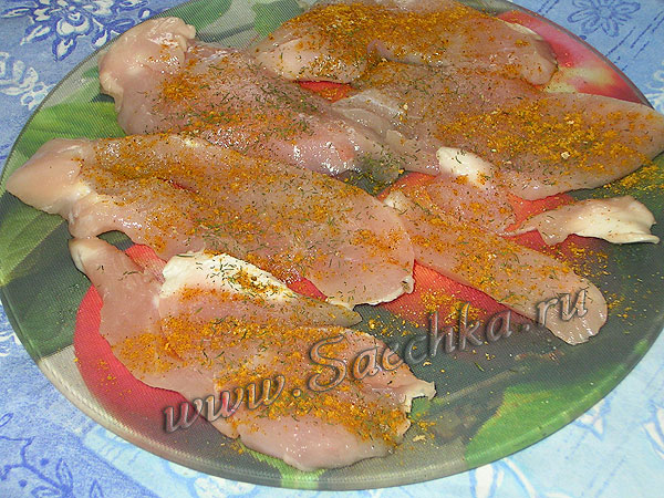 - Куриную грудку посыпать солью и любимыми специями. Отбивать не обязательно.