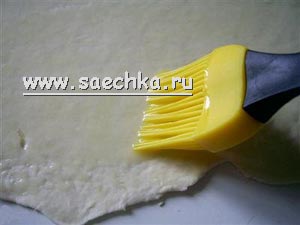 - Раскатать тесто в тонкий пласт, смазать растопленным маслом.