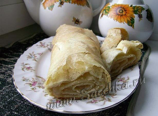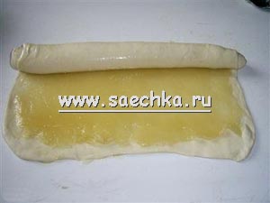 - Выложить ровным слоем начинку, свернуть рулетом, сверху немного приплюснуть.