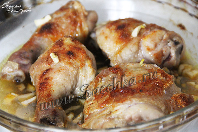 - Нарезать лук полукольцами, покрыть им куриные ножки.