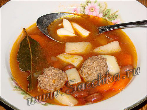 - В кипящую воду бросаю шарики фарша из говядины, затем кусочки морковки (можно заморозку), далее картофель, репчатый лук.