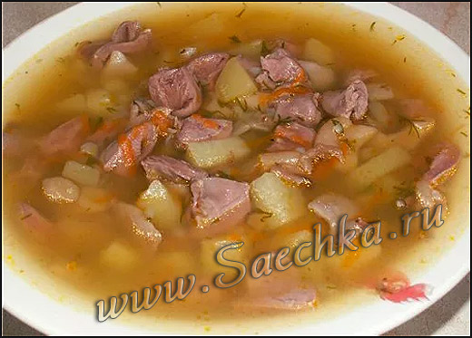 - Когда картофель будет уже готов, добавить в суп с сердечками гречку, приправу и порезанный мелко укроп.