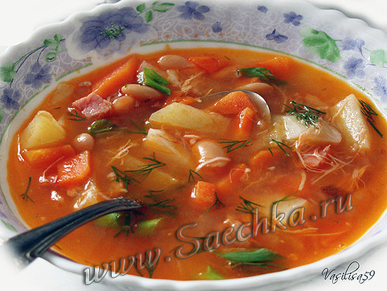 Томатный фасолевый суп приготовлен в «советской» скороварке, но рецепт легко приспосабливается к современной мультиварке-скороварке.