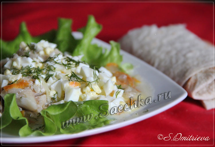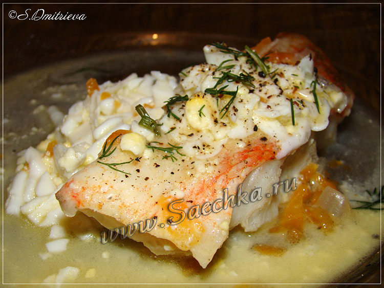 Растопим 50 г сливочного масла, добавим в него 5 ст. ложек (по вкусу можно и больше) рыбного бульона (из нашей кастрюльки с готовой рыбой), пару ст.ложек лимонного сока и два мелко нарубленных (или натёртых на крупной тёрке) варёных яйца. - Кусочки рыбы выкладываем в тарелку, рядом укладываем морковку с луком.